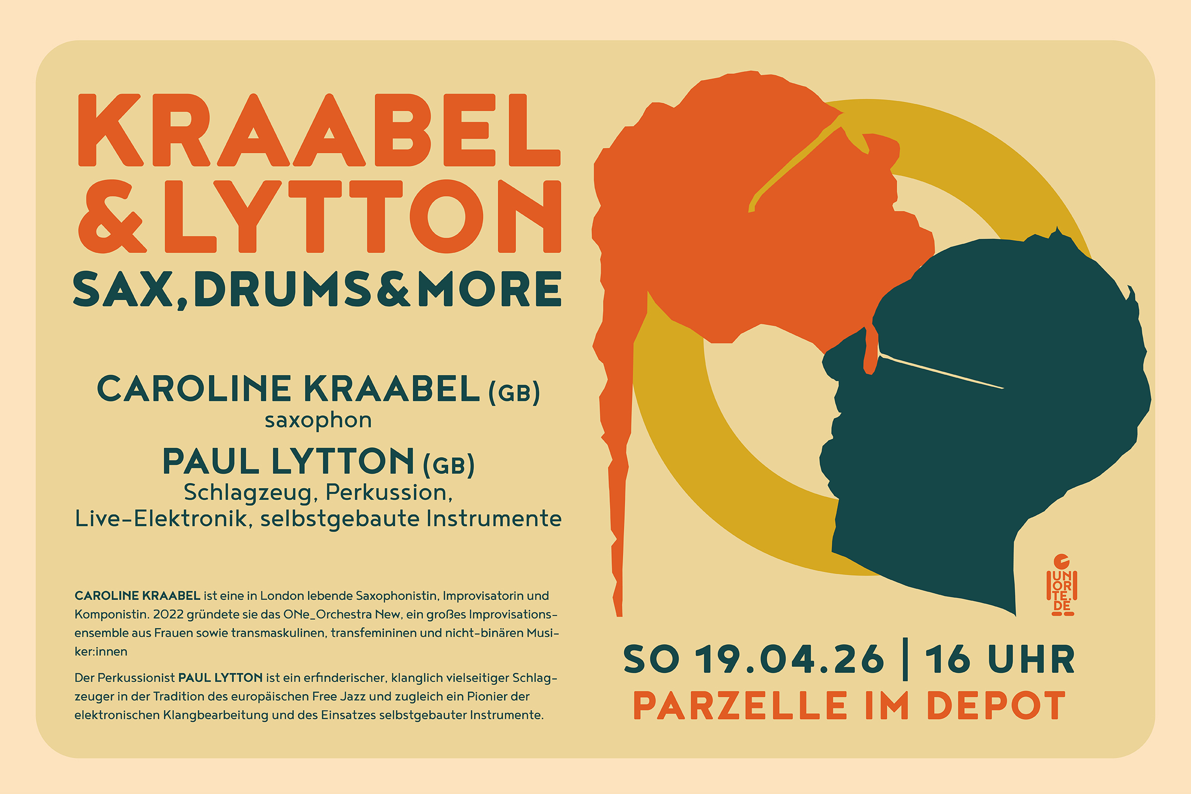 SO | 19.04.2026 | 16:00 Uhr Konzert am Sonntagnachmittag KRAABEL – LYTTON Caroline Krabbel – Saxophon Paul Lytton – Schlagzeug, Perkussion, Live-Elektronik, selbstgebaute Instrumente Der Perkussionist Paul Lytton ist ein erfinderischer, klanglich vielseitiger Schlagzeuger in der Tradition des europäischen Free Jazz und zugleich ein Pionier der elektronischen Klangbearbeitung und des Einsatzes selbstgebauter Instrumente. Lytton feierte Ende der 1960er-Jahre seine ersten bemerkenswerten Auftritte in der britischen Musikszene, und sein Einfluss – insbesondere im Bereich der Live-Elektronik – ist auch über 30 Jahre später noch im Experimentieren einer neuen Generation von Improvisatoren spürbar. (Dave Lynch) …er hebt die Zeitmessung nicht so sehr auf, sondern erschafft sie in einem stillen, riesigen Raum neu; gewaltige Klangmassen und Strukturen scheinen in der Luft zu schweben. Es ist ein beunruhigendes Erlebnis. (R. Cook) Paul Lytton ist vertreten auf: Island, Incus, Moers, Cramps, Hohe Ufer Konzerte, Horo, Po Torch, Uhlklang, SAJ, JND, Bead, Intakt, ECM, Leo Records, CIMP, Rastascan, Maya, Hybrid, Emanem, Wobbly Rail. Caroline Kraabel ist eine in London lebende Saxophonistin, Improvisatorin und Komponistin. 2022 gründete sie das …